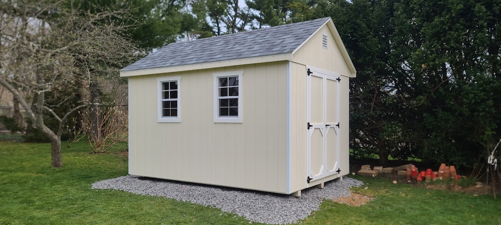 The Cape style shed has a 7/12 Roof pitch which mimics the look of most homes. It is a popular and economical choice to match the roof pitch of our standard garden shed without the additional options. Capes come standard with 6ft tall wall studs, a set of double doors, 2 windows, 2 gable vents, and an